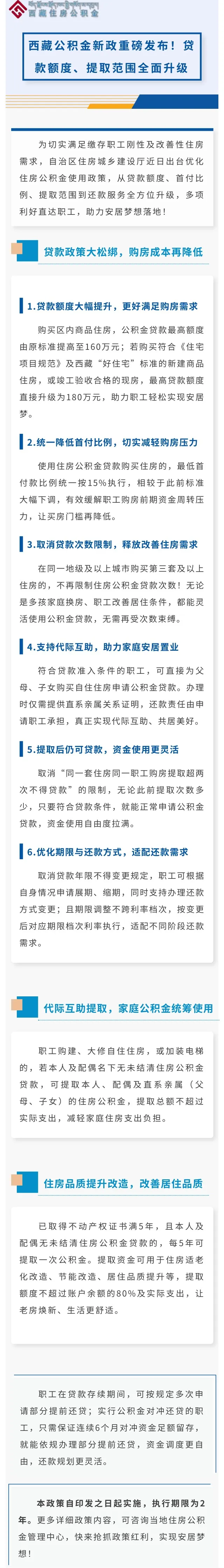 据西藏自治区住房和城乡建设厅微信公众号,西藏公积金新政发布,政策自印发之日起实施。其中,购买区内商品住房,公积金贷款最高额度由原标准提高至160万元;若购买符合《住宅项目规范》及西藏“好住宅”标准的新建商品住房,或竣工验收合格的现房,最高贷款额度直接升级为180万元。