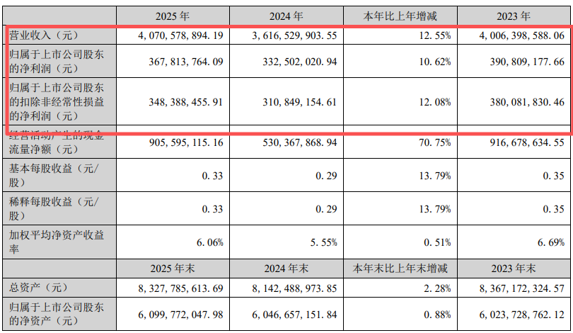 据年报,2025年,天润工业实现营业收入40.71亿元,同比增长12.55%;归属于上市公司股东的净利润3.68亿元,同比增长10.62%;归属于上市公司股东的扣除非经常性损益的净利润3.48亿元,同比增长12.08%;经营活动现金流净额达到9.06亿元,同比大幅增长70.75%。