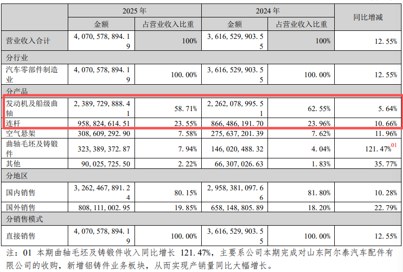 作为国内最大的曲轴专业生产企业和国内最大的中重型商用车胀断连杆生产企业,天润工业的传统主业依然是业绩的“压舱石”。年报显示,曲轴、连杆业务营业收入占公司营业收入的82.26%,业务集中度较高。