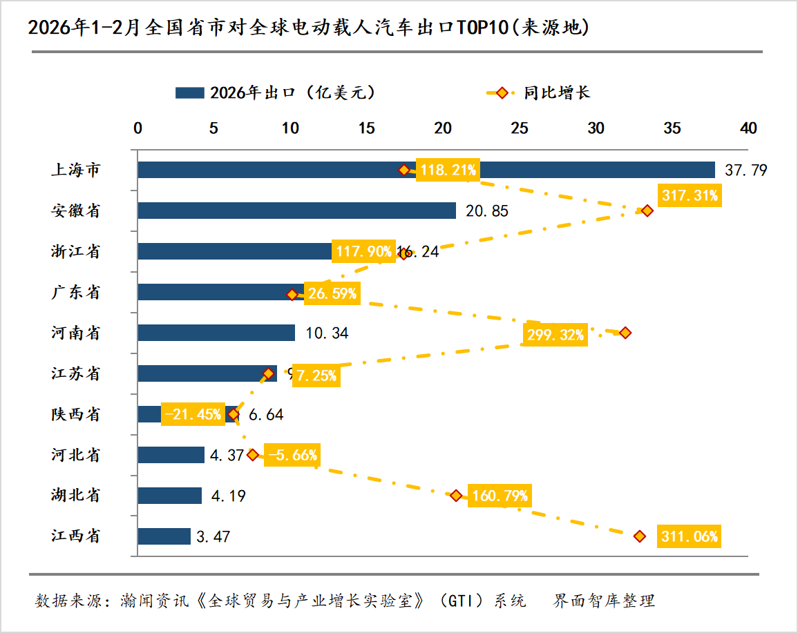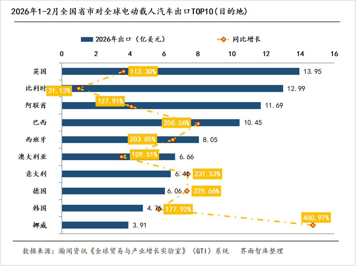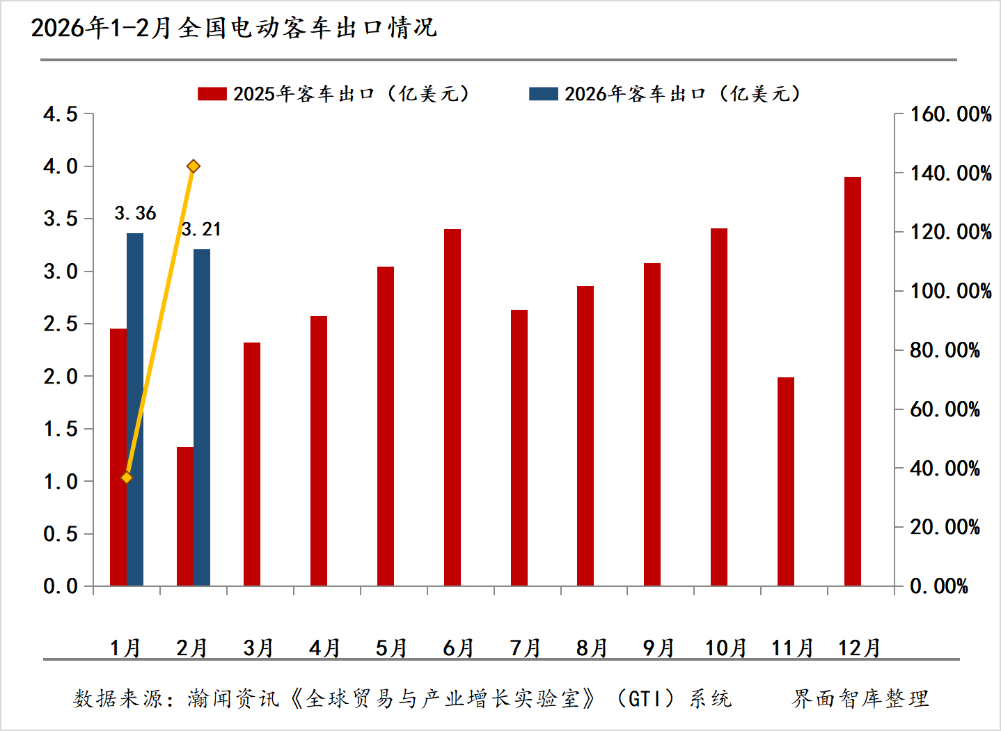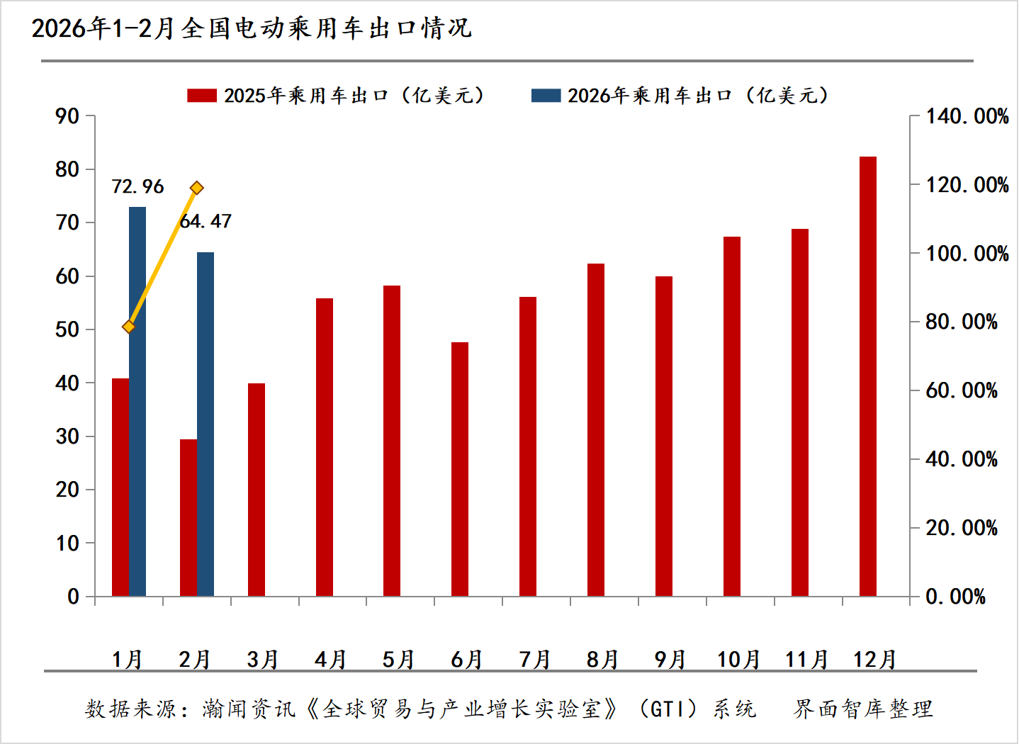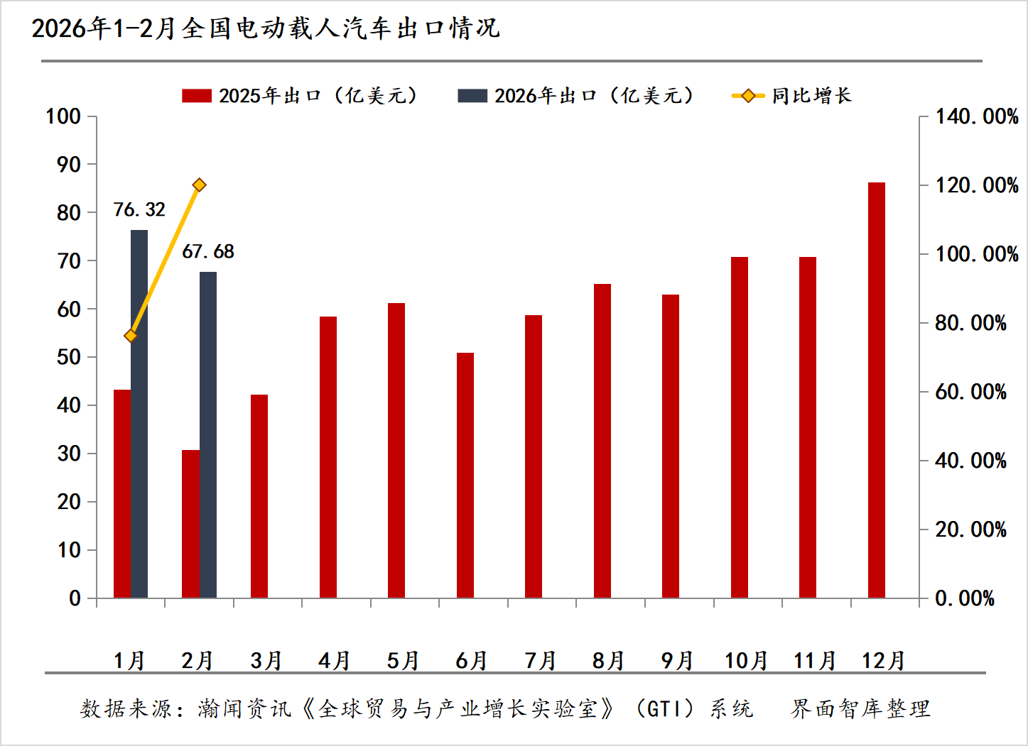 根据界面智库与瀚闻资讯统计,2026年1-2月,中国电动载人汽车出口实现“开门红”,呈现量价齐升、结构优化的强劲增长态势。1—2 月累计进出口总额 148.62 亿美元,同比增长 93.01%;其中出口金额 144.01 亿美元,同比大幅增长 94.40%,出口数量 75.80 万辆,同比增长 86.11%,在高基数基础上继续保持强劲增长势头。