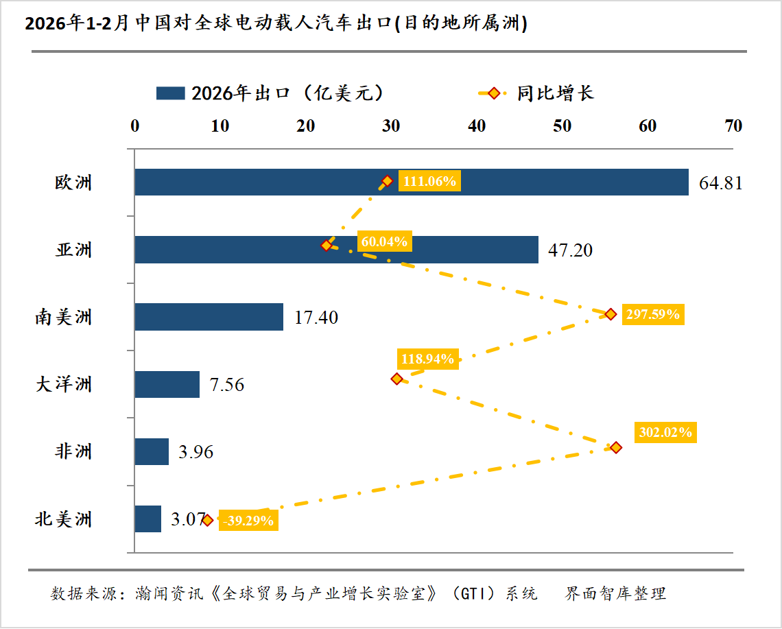 从目的地所属大洲来看,1-2月,中国电动载人汽车已出口至171个国家/地区,其中非洲国家/地区占50个,贸易总额达到3.96亿美元,同比大幅增长302.02%;而出口贸易额最高的大洲为欧洲,总额达到64.81亿美元,同比增长111.06%。