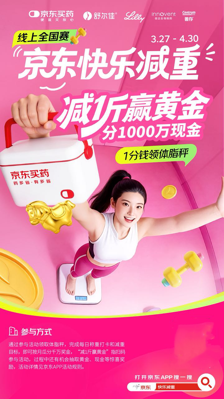 自3月27日京东“快乐减重”线下城市赛启动以来,活动凭借“减一斤给100元”的减重激励,迅速收获全国用户广泛关注与参与。用户报名成功后,可在北京、上海、广州、深圳、天津五城京东大药房预约称重,减重满5斤起给,每减1斤得100元,最高可得1000元现金。