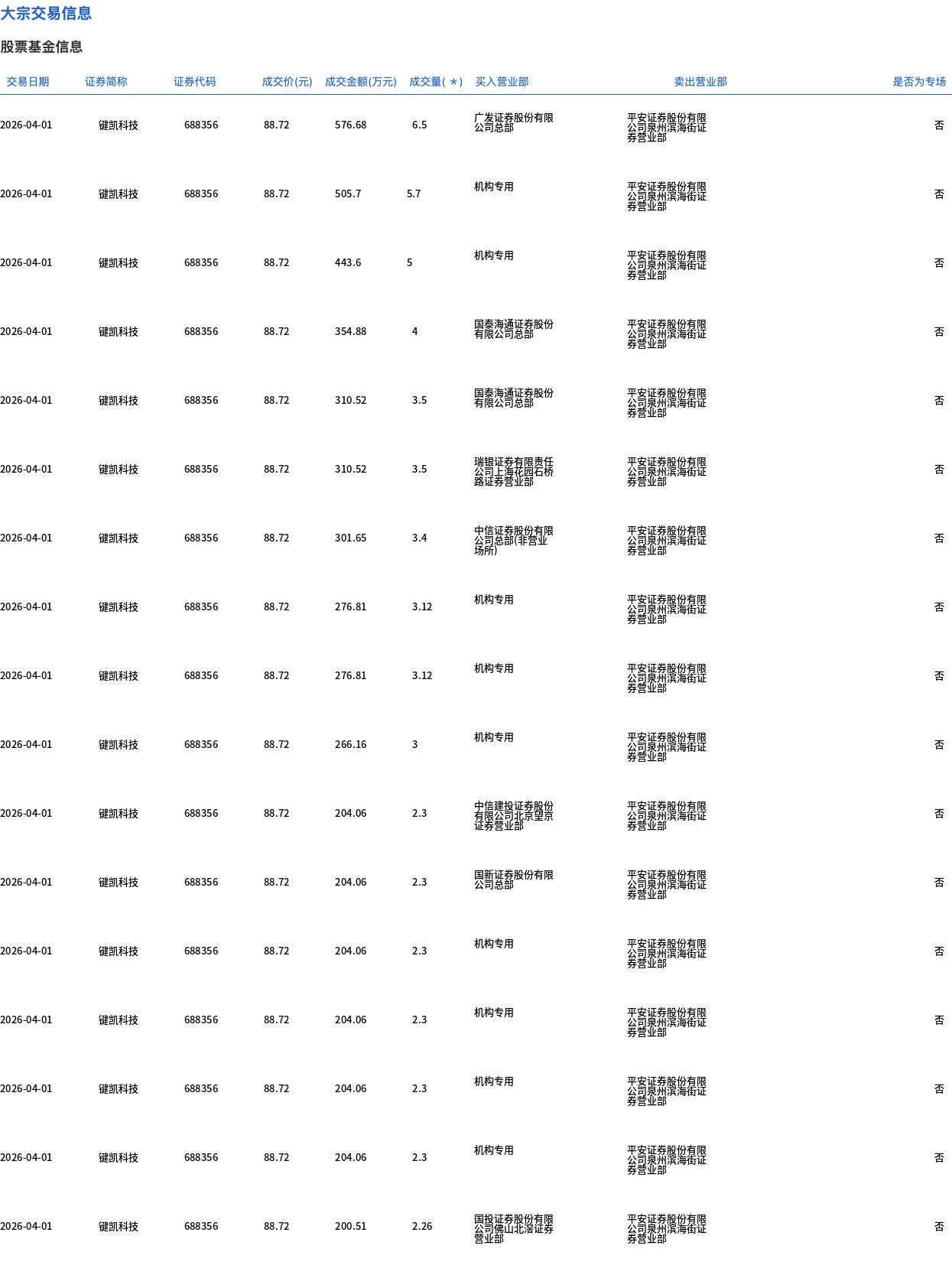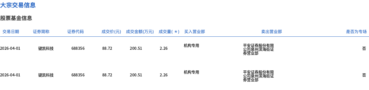 4月1日,键凯科技大宗交易成交61.42万股,成交额5449.22万元,占当日总成交额的30.82%,成交价88.72元,较市场收盘价98.9元折价10.29%。