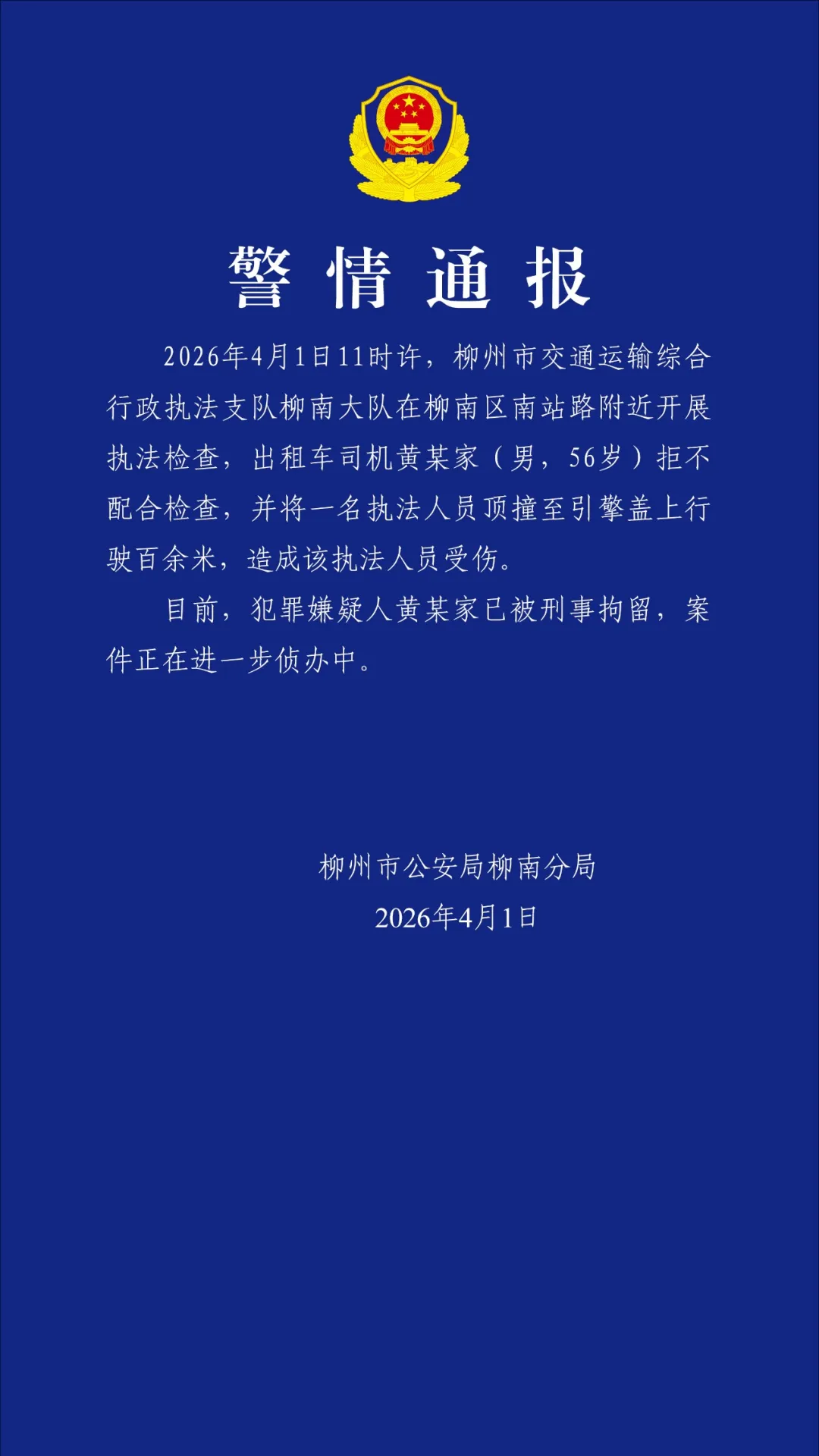 柳州市公安局柳南分局4月1日晚通报:2026年4月1日11时许,柳州市交通运输综合行政执法支队柳南大队在柳南区南站路附近开展执法检查,出租车司机黄某家(男,56岁)拒不配合检查,并将一名执法人员顶撞至引擎盖上行驶百余米,造成该执法人员受伤。
