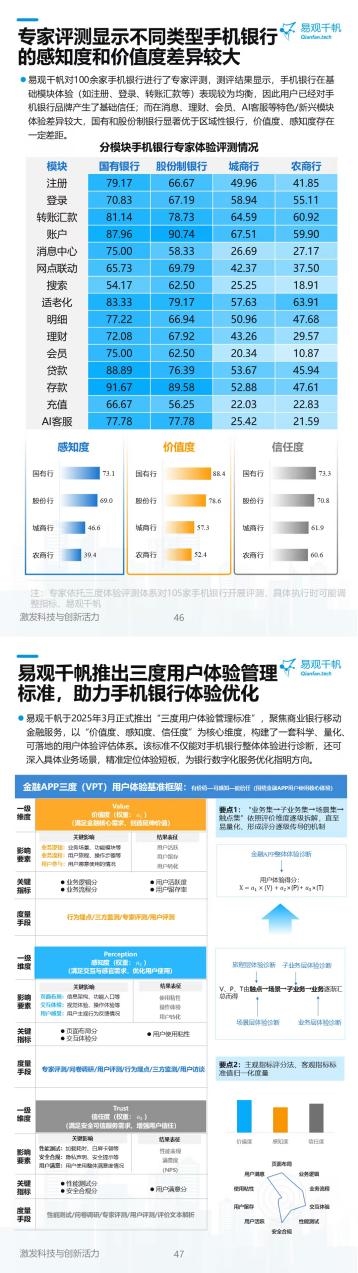 为精准评估手机银行行业体验水平,助力手机银行设计预研、体验检视、APP迭代与服务创新,易观千帆于2025年3月正式推出“三度用户体验管理标准”。该标准聚焦商业银行移动金融服务,以“价值度、感知度、信任度”为核心维度,构建起一套科学、量化、可落地的用户体验评估体系,不仅能对手机银行整体体验进行全面诊断,还可深入具体业务场景,精准定位体验短板。基于这一标准,易观千帆对100余家手机银行开展了专家评测,结果显示,手机银行在注册、登录、转账汇款等基础模块的体验表现较为均衡,也让用户对手机银行品牌形成了基础信任;而在消息中心、理财、会员、AI客服等特色与新兴模块,不同类型银行的体验差异显著,国有行与股份制银行的表现远超区域性银行,二者在价值度、感知度上存在明显差距。