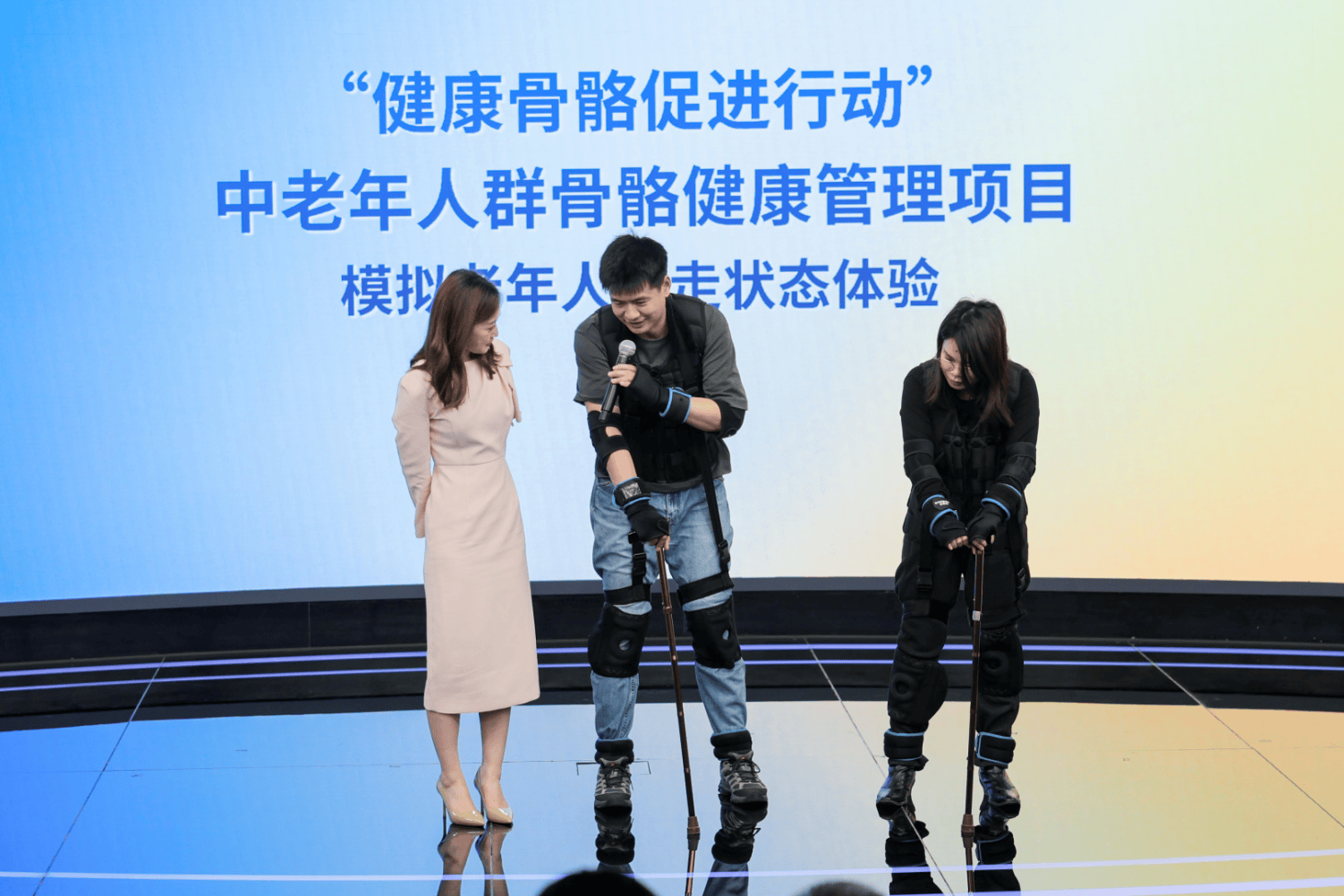 3月29日,《中老年人群骨骼关节健康专家建议》发布会模拟老年人行走体验现场