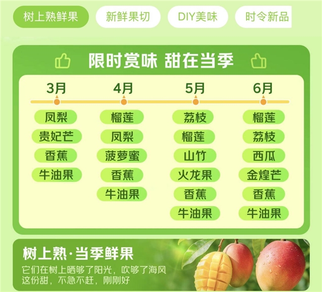 凭借颜值与口感双优的特质,海南树上熟贵妃芒成为近期线上线下的热门水果新品。其“贵妃”之名,正源于成熟后果皮红黄渐变、色泽艳丽的模样,形似唐代贵妃的雍容华贵,自带辨识度。全年无冬的气候条件与显著的昼夜温差,为糖分积累提供了适宜环境。同时,该品采用树上自然熟种植方式,挂果周期达135至150天,不使用膨大剂与催熟工艺,生长期较普通芒果延长15天以上。待果实成熟度达到八分之时,果农及时采摘,采收后24小时内空运直达七鲜门店,确保消费者开箱即可直接食用,无需额外等待催熟。值得一提的是,贵妃芒的最佳赏味期仅为4月一整月,错过便要再等一年,堪称春日限定的时令馈赠。