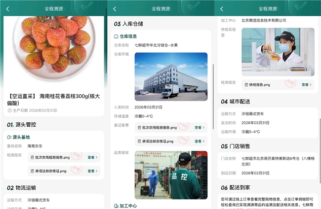 以海南桂花香荔枝为例,点击其商品页面的“全程溯源”,即可查看该批次商品从采收后初检、仓储复检到门店终检的三轮农残检测报告,运输方式、到店日期等信息也同步呈现。更具优势的是,这套溯源系统实现动态实时更新,每一批次水果的当日真实状态均可查询,彻底告别“溯源信息与实际不符”的行业痛点,让消费者买到的每一颗水果,都不是“盲盒”,而是有据可查的安心之选。