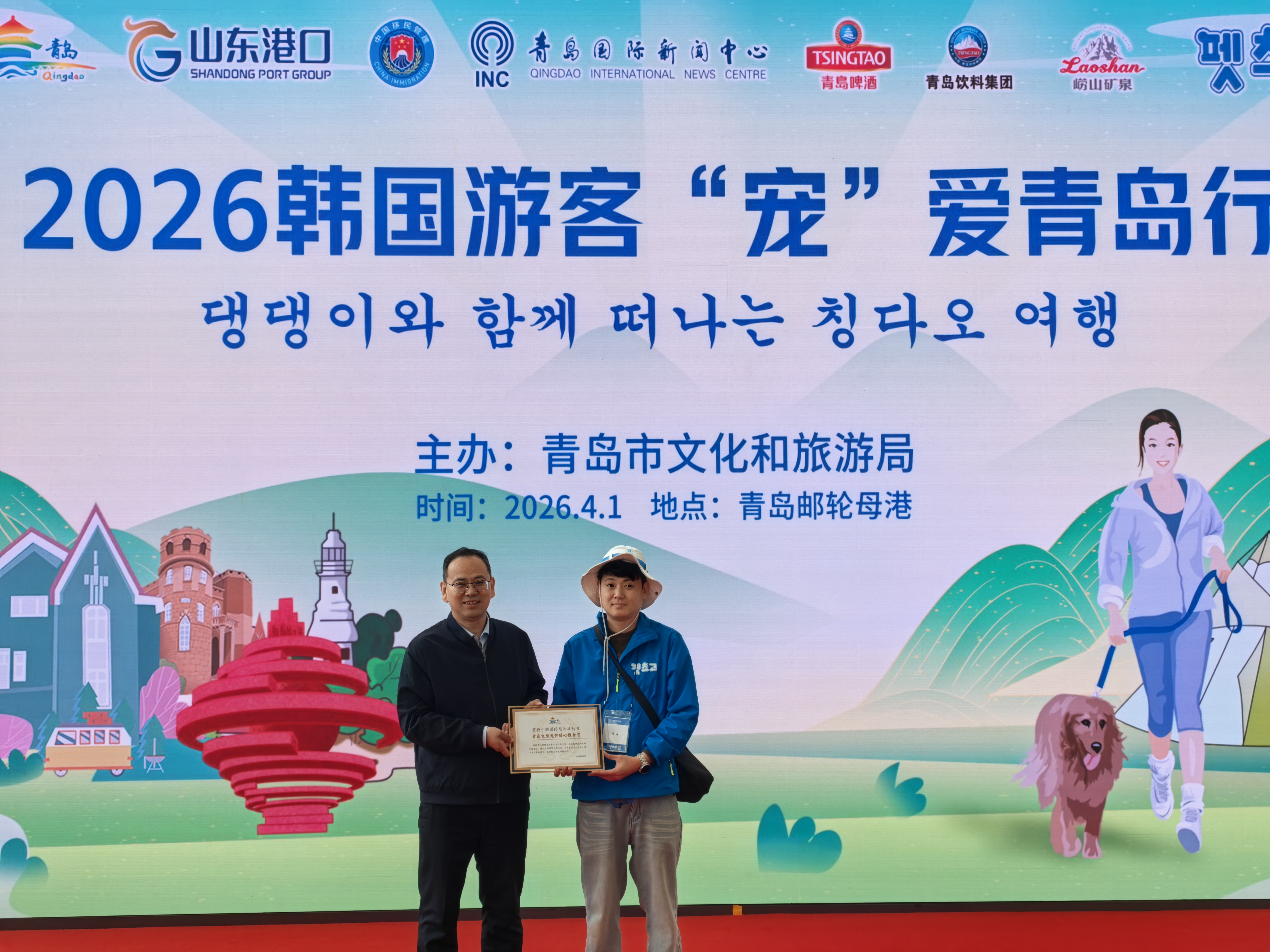 4月1日上午,“韩国游客‘宠’爱青岛行”欢迎仪式在青岛邮轮母港举行,首批韩国携宠游客乘船顺利抵青。这是全国前列、山东首个规模化韩国携宠入境旅游团,标志着青岛在开拓中韩宠物友好旅游细分市场、培育入境旅游新增长点上实现标志性突破。活动由青岛市文化和旅游局指导,山东港口邮轮发展集团、青岛边防检查站、青岛国际新闻中心、青岛啤酒集团、青岛饮料集团等单位联合支持。
