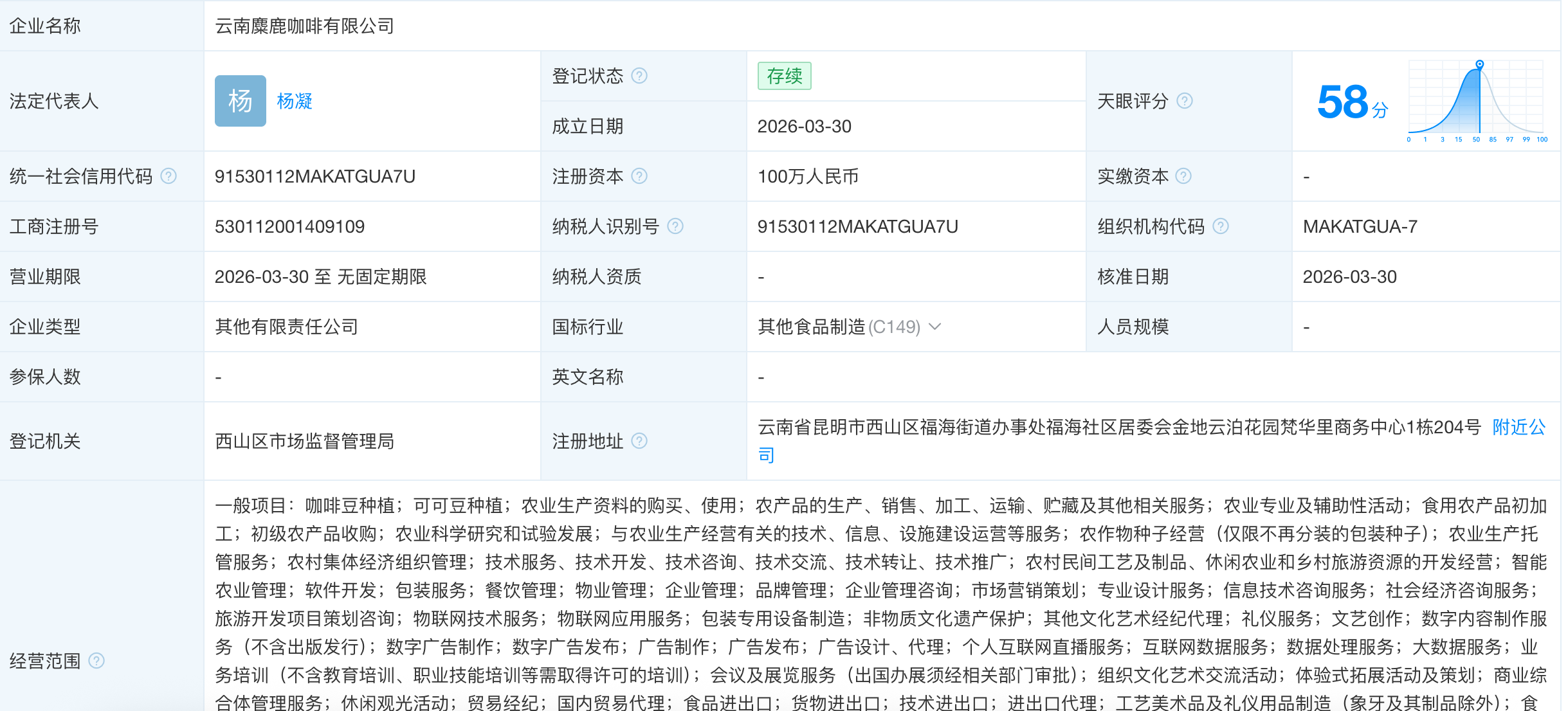 天眼查工商信息显示,近日,云南麋鹿咖啡有限公司成立,法定代表人为杨凝,注册资本100万元人民币,经营范围包括咖啡豆种植、食用农产品批发、食用农产品零售、食品互联网销售等。