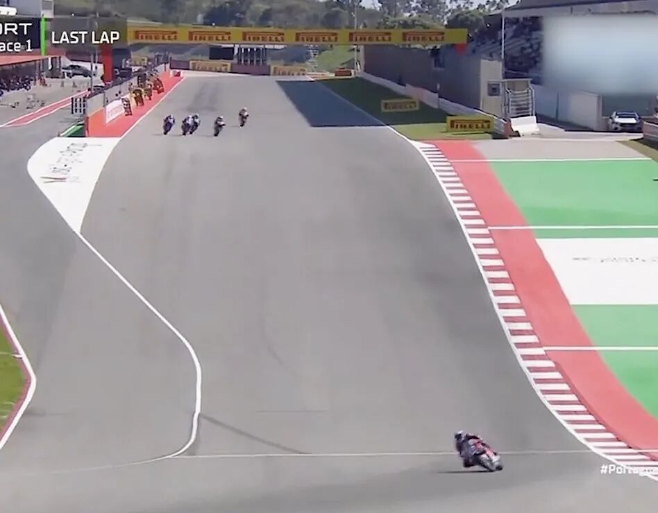 葡萄牙波尔蒂芒赛道上,一群川崎、雅马哈、杜卡迪互不相让地挤成一团。它们车前是一片空旷的无人区,几乎占据了一半的画面,直到将视线挪至最下方,才看到一辆张雪820RR摩托车一骑绝尘。
