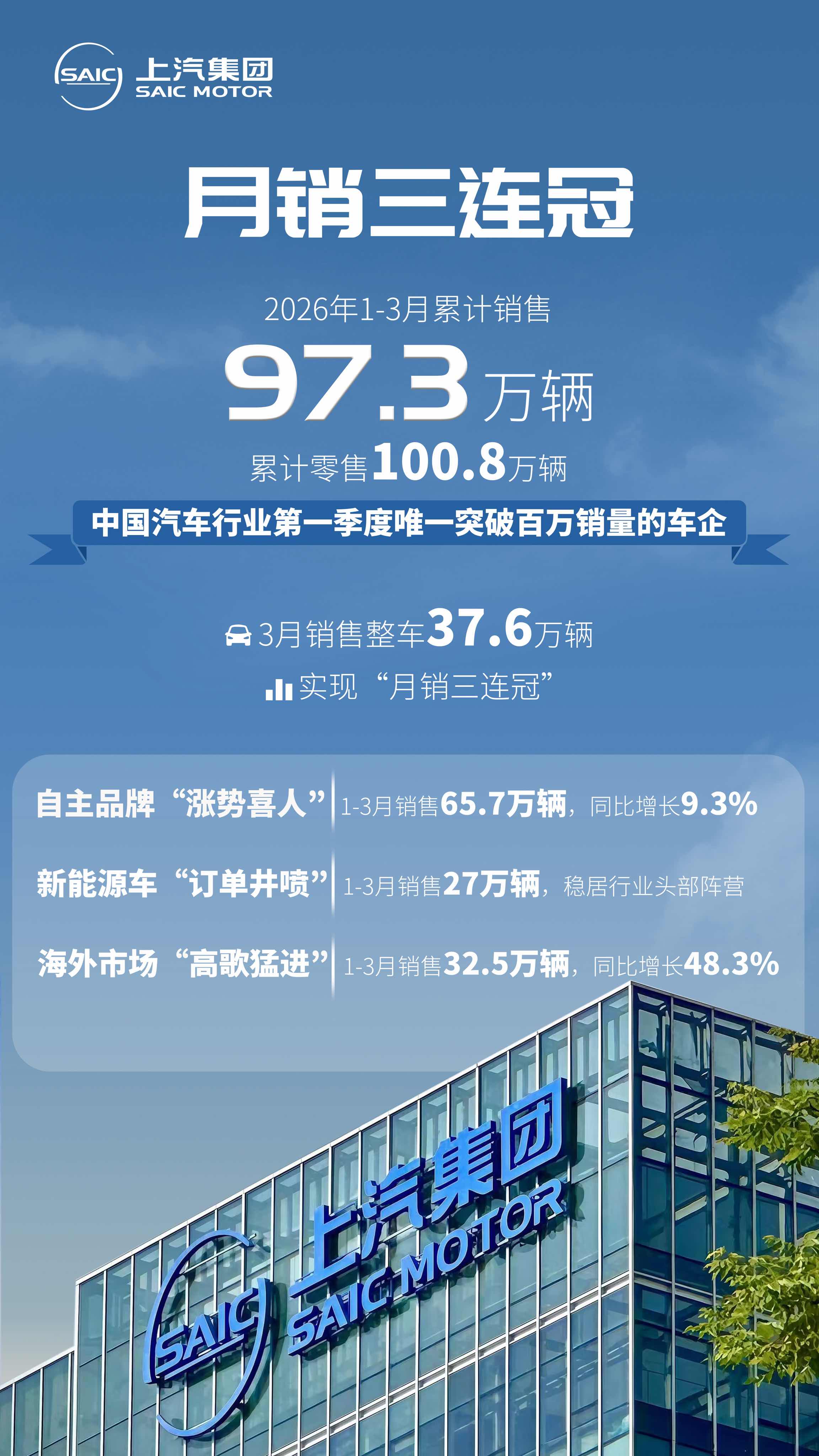 上汽集团发布最新销量数据,3月份实现整车销售37.6万辆,今年以来成功实现“月销三连冠”;1-3月累计实现批售97.3万辆,同比增长3%,保持稳步攀升态势;实现零售100.8万辆,成为中国汽车行业第一季度唯一突破百万销量的车企。