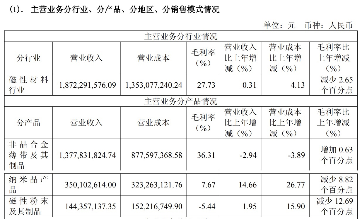 从业务结构来看,非晶合金薄带及其制品仍是公司的主要收入来源。年报显示,2025年该板块实现收入13.78亿元,占营业收入的72.92%,同比小幅下滑2.94%。纳米晶产品收入为3.5亿元,同比增长14.66%,收入占比提升至18.53%。磁性粉末及其制品收入为1.44亿元,同比增长1.95%。
