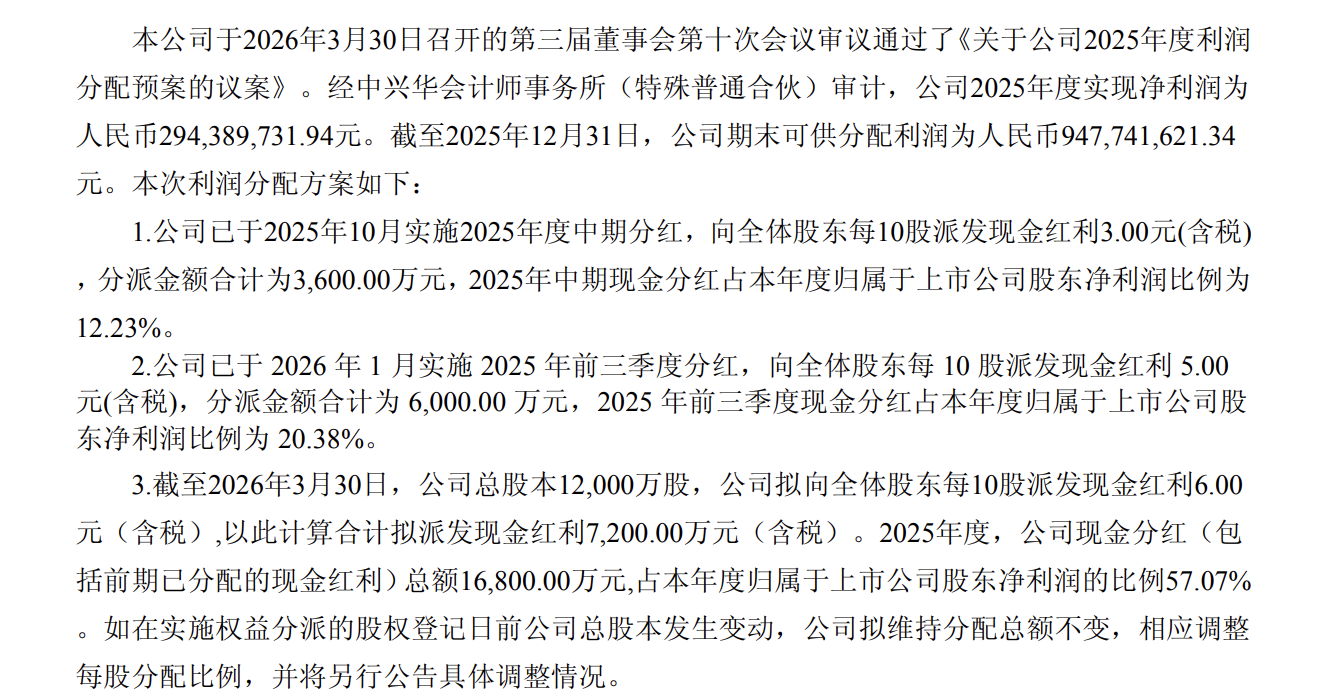 与此同时,公司公布了2025年度利润分配预案。根据预案,公司拟向全体股东每10股派发现金红利6元(含税),合计派发7200万元。叠加2025年中期已分配的3600万元及前三季度分配的6000万元,全年现金分红总额为1.68亿元,占年度归母净利润的比例为57.07%。
