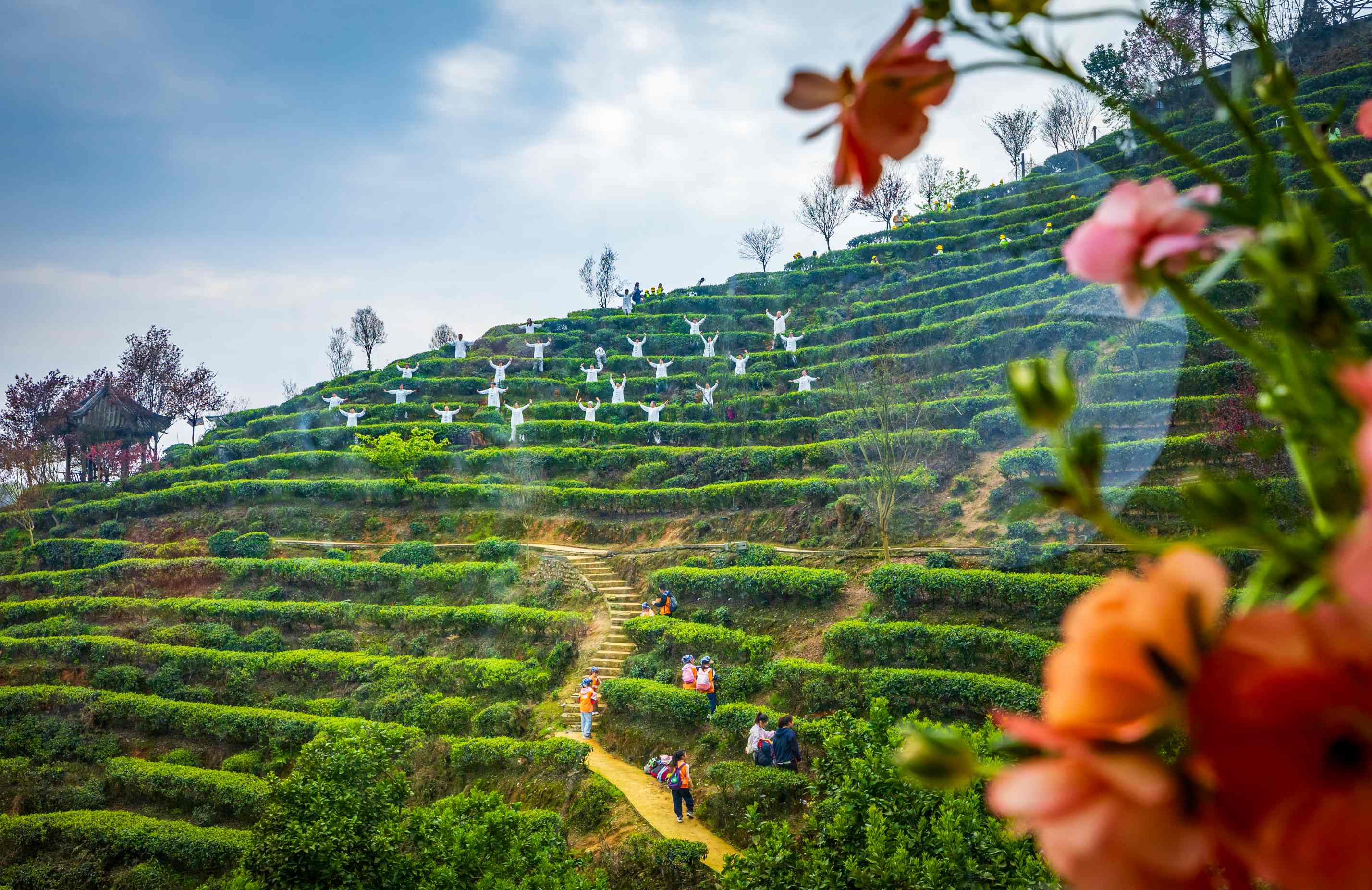 阳春三月,站在茶溪谷“敬献中国礼的这茶山”上远眺,四面环山,山涧溪水环绕,青山秀水的蒲阳秀色尽收眼底。伴随着“五采”蒲阳文化旅游视频展示,市网络文化协会会长、蒲阳文旅推介官黄维介绍了2026年度蒲阳“五采”活动的宣传营销矩阵,成都市女创联盟首任盟主、都江堰茶溪谷总经理王小琴团队展示了“尽显中国风”的大国外交茶产品和“敬献中国礼”的蜀道茶艺,“五采”蒲阳寻美处活动——蒲阳街道全域旅游采摘线路正式出炉。首先是‘汉韵茶香’传统采茶与制茶、蜀道茶艺体验活动。在接下来的时间里,“四季有主题,月月有活动”的茶马文旅,让大家沉浸式地融入“昔日茶马古道”古韵,感受厚重的茶文化,体验“迢迢千年茶马路,铮铮铁骨行者梦”的祖辈们壮举,将茶艺茶道、田园生活、户外运动、研学体验、休闲度假融为一体。