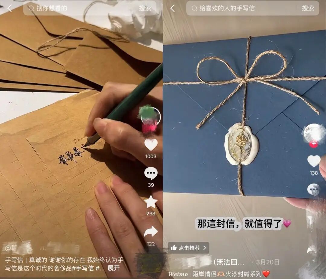 图:社交平台上关于手写信的展示 来源:抖音