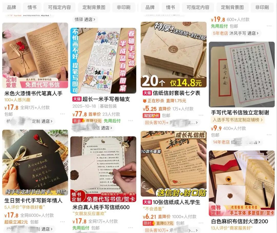 《听筒Tech》注意到,在淘宝、小红书、抖音等平台上,“手写信定制”已经成为一个小众但增长迅猛的赛道。