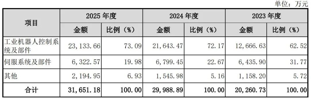 其中,新睿电子的工业机器人控制系统主要应用于直角坐标机器人(也称机械手),聚焦于注塑机机械手和各类数控机床桁架式机械手等应用场景。2023年—2025年(下称“各期”),该公司的工业机器人控制系统及部件产品分别实现收入1.27亿元、2.16亿元和2.31亿元,分别占主营业务收入的62.52%、72.17%和73.09%,是公司的主要收入来源。