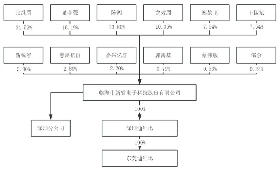 截至目前,张继周直接持有新睿电子34.52%的股份,并通过新锐泓这一员工持股平台间接控制3.8%的表决权。而董李强直接持股16.19%,为张继周的一致行动人。张继周因此合计控制新睿电子54.51%的表决权,是公司实控人、控股股东,并任公司董事长、总经理兼研发部经理。董李强则任公司董事兼研发部副经理。