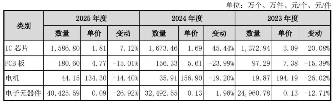 近年来,新睿电子主要原材料的采购价格均呈下行态势。其中,IC芯片的平均采购单价从2023年的3.09元/个降至2025年的1.81元/个,同期PCB板的单价也从7.38元/个降至4.77元/个,电机的采购单价则从194.19元/个降至134.3元/个,公司称主要是受市场价格下降以及采购量增加使议价能力增强的共同影响。