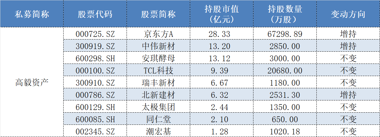 另一方面,邓晓峰选择继续加仓京东方A(000725.SZ)和北新建材(000786.SZ)。截至年报,“高毅晓峰2号致信基金”持有3.52亿股京东方A,“高毅晓峰鸿远”新进成为该股第十大流通股东,持股数量为3.21亿股,两只产品期末持仓参考市值合计为28.33亿元;上述两只产品还在去年第四季度累计增持50万股北新建材,期末持仓参考市值合计为6.32亿元。