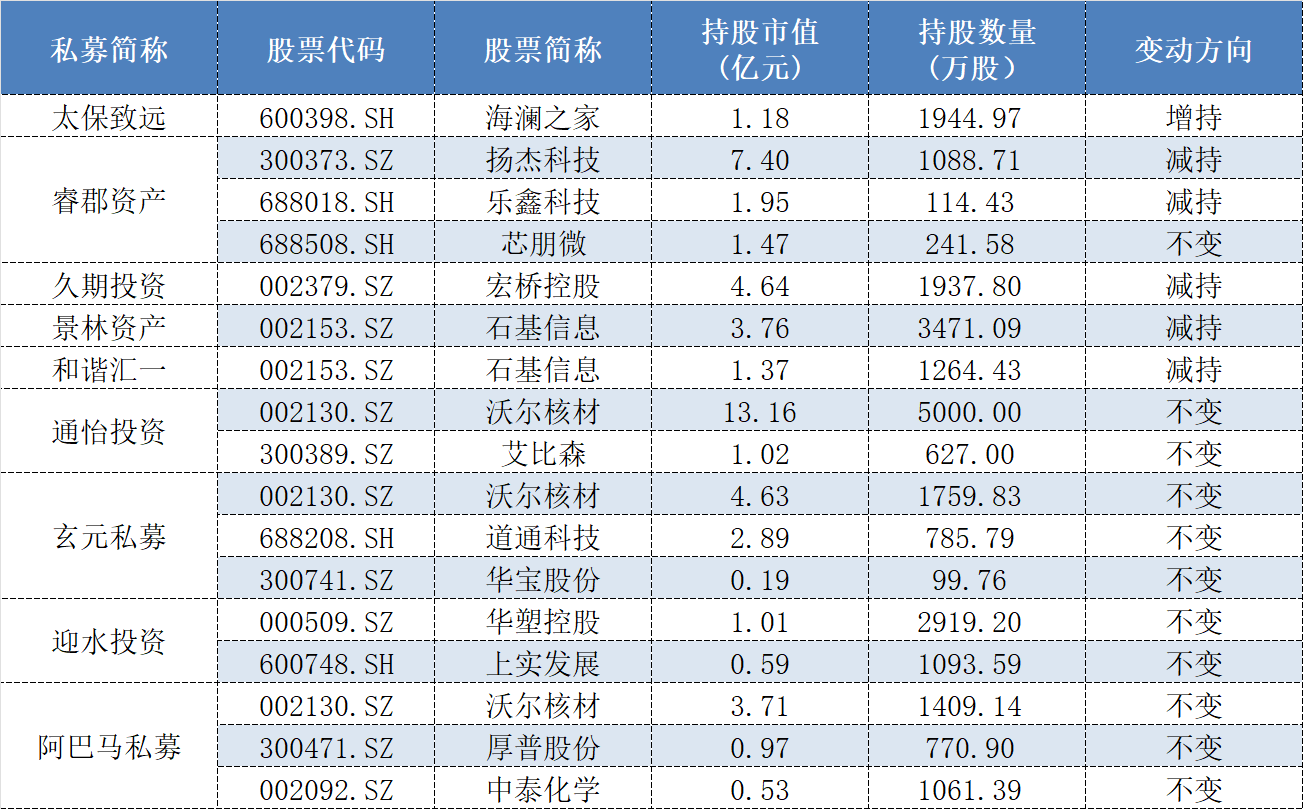 聚鸣投资积极“纳新”,同步晋级为涛涛车业(301345.SZ)、佛塑科技(000973.SZ)、粤桂股份(000833.SZ)等三只个股2025年年报前十大流通股东之一,期末持仓参考市值分别为1.91亿元、1.64亿元和5342.74万元,同时减持15.1万股广信科技(920037.BJ)。