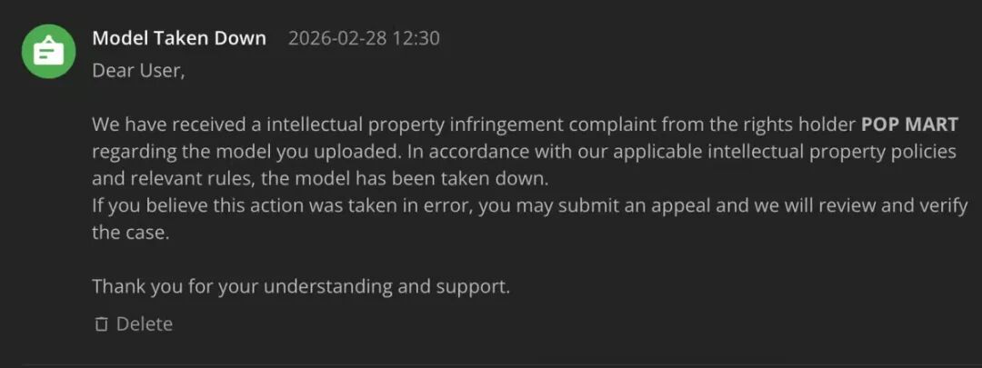 泡泡玛特打响了“版权保卫战”后,胖鲸观察到,包括美泰在内的多家国际 IP 方,也开始对拓竹社区中的相关模型展开大清扫。