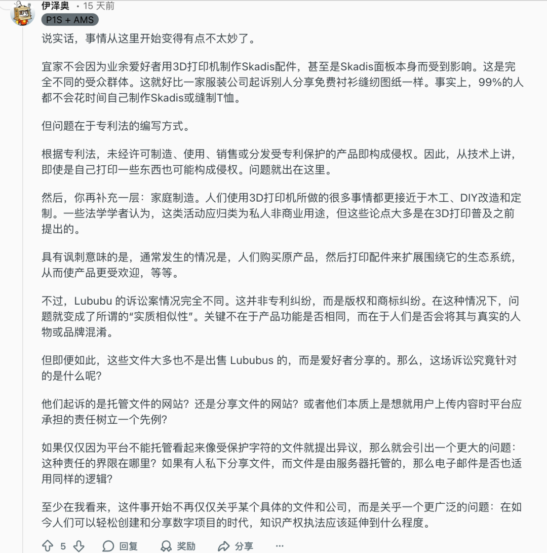 在拓竹的 Reddit 社群中,一位资深用户写道:宜家不会因为用户用 3D 打印制作配件而受到影响,就像服装公司不会起诉分享缝纫图纸的人。问题在于法律的编写形式。