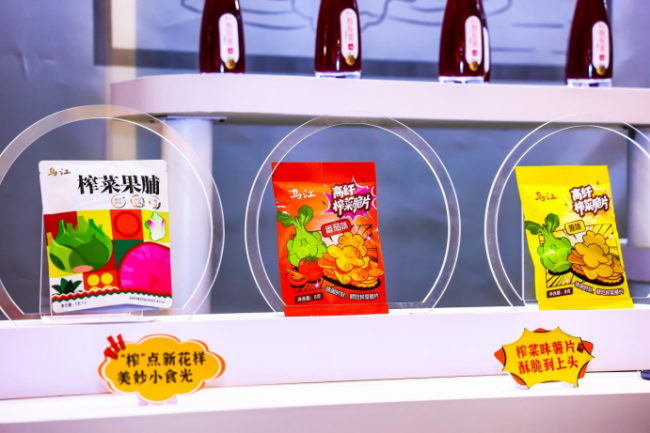 在传统品类升级之外,涪陵榨菜集团更实现了品类边界的突破性延伸。全新上市的乌江榨菜脆片、胭脂萝卜果汁、榨菜果脯三款产品,通过榨菜品类的创新与健康化配方升级,跳出了传统佐餐菜的品类限制,打造出独具地方特色的休闲食品新标杆。