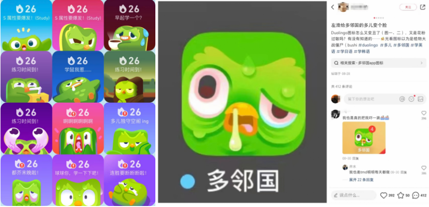 以语言学习应用多邻国(Duolingo)的IP“多儿(Duo)”为例,以“逼学狂魔”的沙雕人设出圈。这只绿色猫头鹰没有走“知识偶像”路线,反而带着一丝“阴阳怪气”的特质,用“威胁式”推送、趣味表情包戳中年轻人的拖延症与畏难心态,以戏谑自嘲的互动方式,成为全网自发玩梗的社交货币。