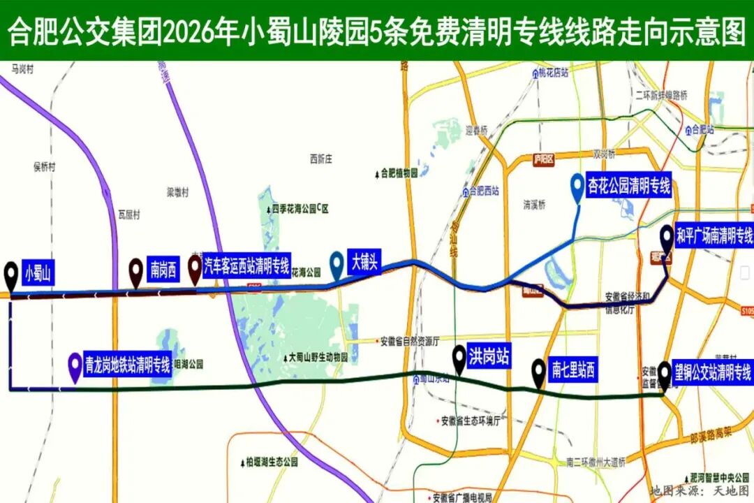 合肥公交集团2026年小蜀山陵园5条免费清明专线线路走向示意图。