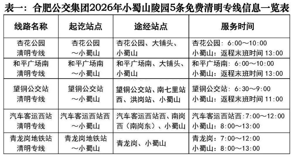 1.清明祭扫专线:合肥公交集团将于4月4日至6日分别开通自杏花公园、和平广场南、望铜公交站、汽车客运西站、青龙岗地铁站共5条直达小蜀山的清明专线,到小蜀山陵园祭扫的市民免费乘车。