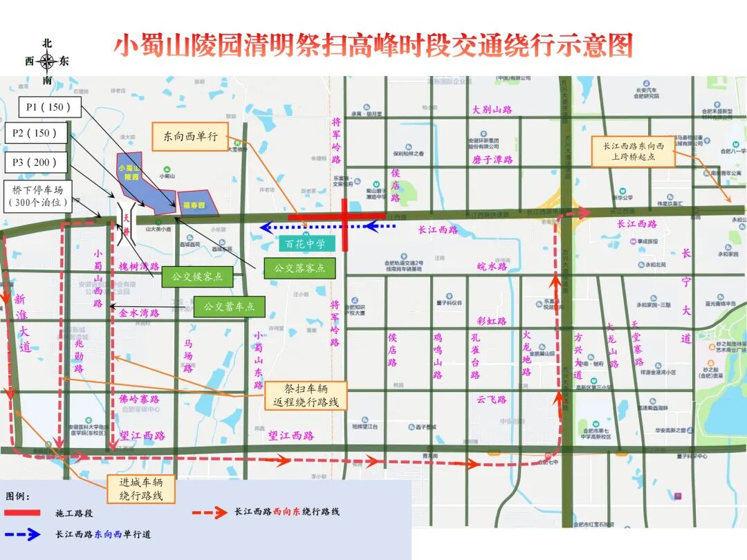 2.返程:因长江西路(侯店路—小蜀山东路)处于双雷线立交工程施工中,道路通行有限,4月4日至6日,清明祭扫高峰时段,将长江西路(候店路—小蜀山西路)设为东向西单行道;进城车辆可由新淮大道→望江西路→方兴大道→绕行至长江西路,祭扫车辆由兆勋路(小蜀山西路)→望江西路→方兴大道,绕行至长江西路返程。