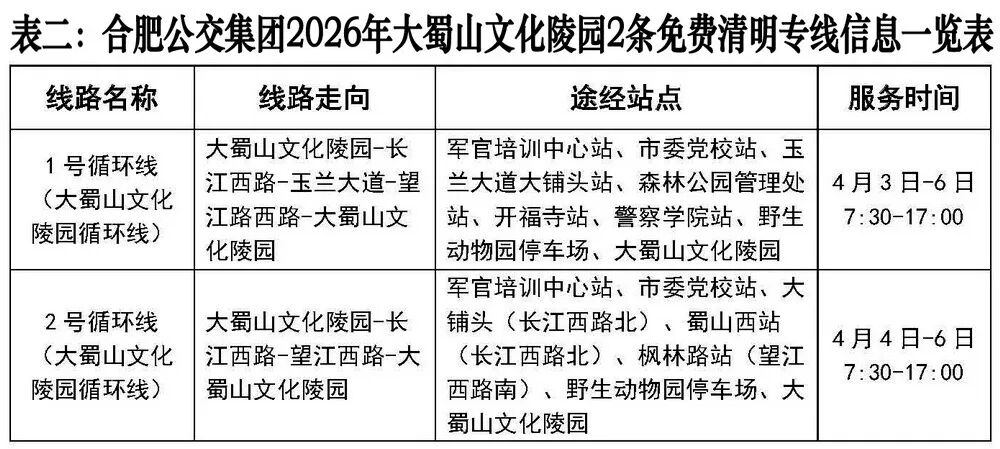1.清明祭扫专线:合肥公交集团将于4月3日至6日开行大蜀山文化陵园循环线1号线、2号线,到大蜀山文化陵园祭扫的市民免费乘车。