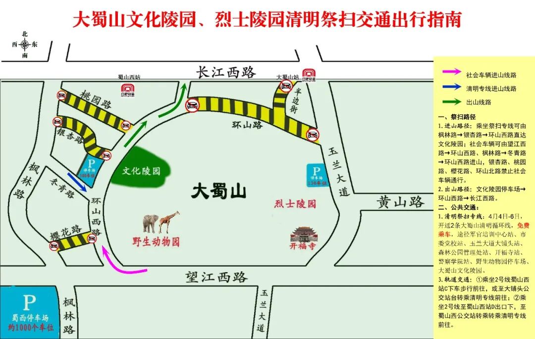 3. 常规公交:乘坐20、29、85、156、311、234、44、118、B2、43、48、102路公交,分别在大铺头、蜀山森林公园、警察学院站转乘清明专线入园。