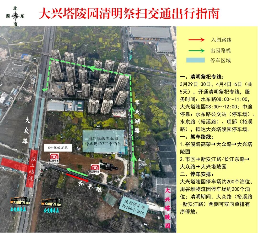 大兴塔陵园停车场约200个泊位、周谷堆物流园停车场约200个泊位;清明期间,大众路(裕溪路-新安江路)两侧可单排有序停放。