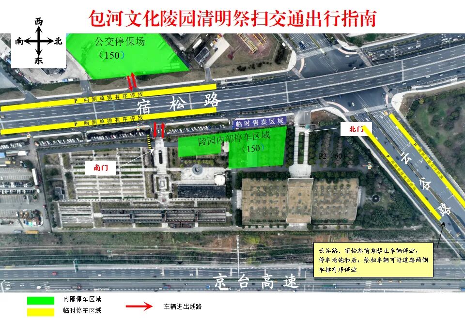 3.云谷路、宿松路前期禁止车辆停放,各内部停车场饱和后,祭扫车辆可依次沿云谷路(玉龙路—始信路)、宿松路(云谷路—始信路)两侧单排有序停放。