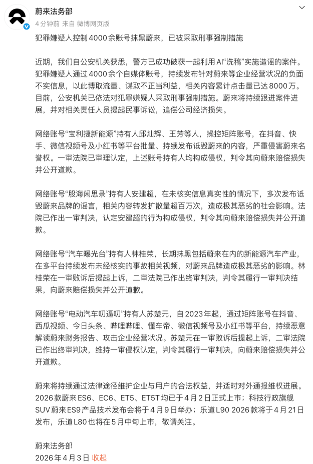 4月3日,蔚来法务部发文表示,近期自公安机关获悉,警方已成功破获一起利用AI“洗稿”实施造谣的案件。犯罪嫌疑人通过4000余个自媒体账号,持续发布针对蔚来等企业经营状况的负面不实信息,以此博取流量、谋取不正当利益,相关内容累计点击量已达8000万。目前,公安机关已依法对犯罪嫌疑人采取刑事强制措施。