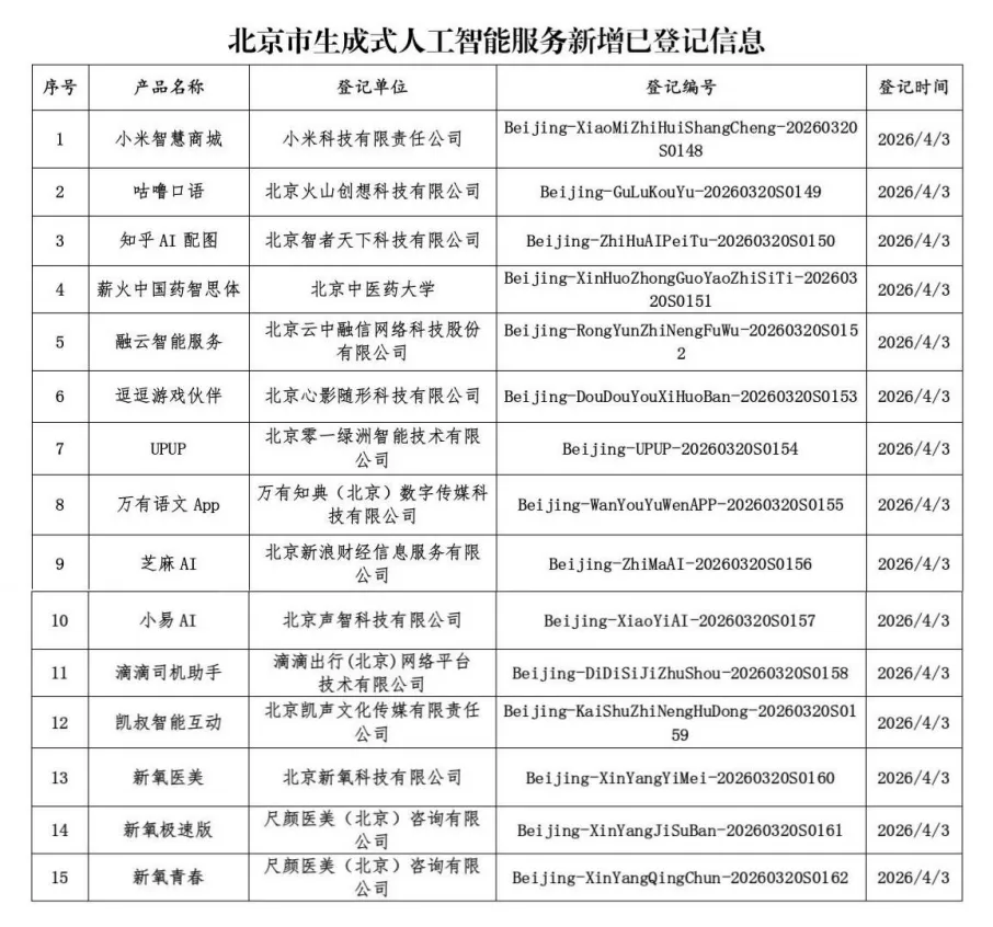 4月3日,据网信北京消息,截至2026年4月3日,北京市新增15款已完成登记的生成式人工智能服务。