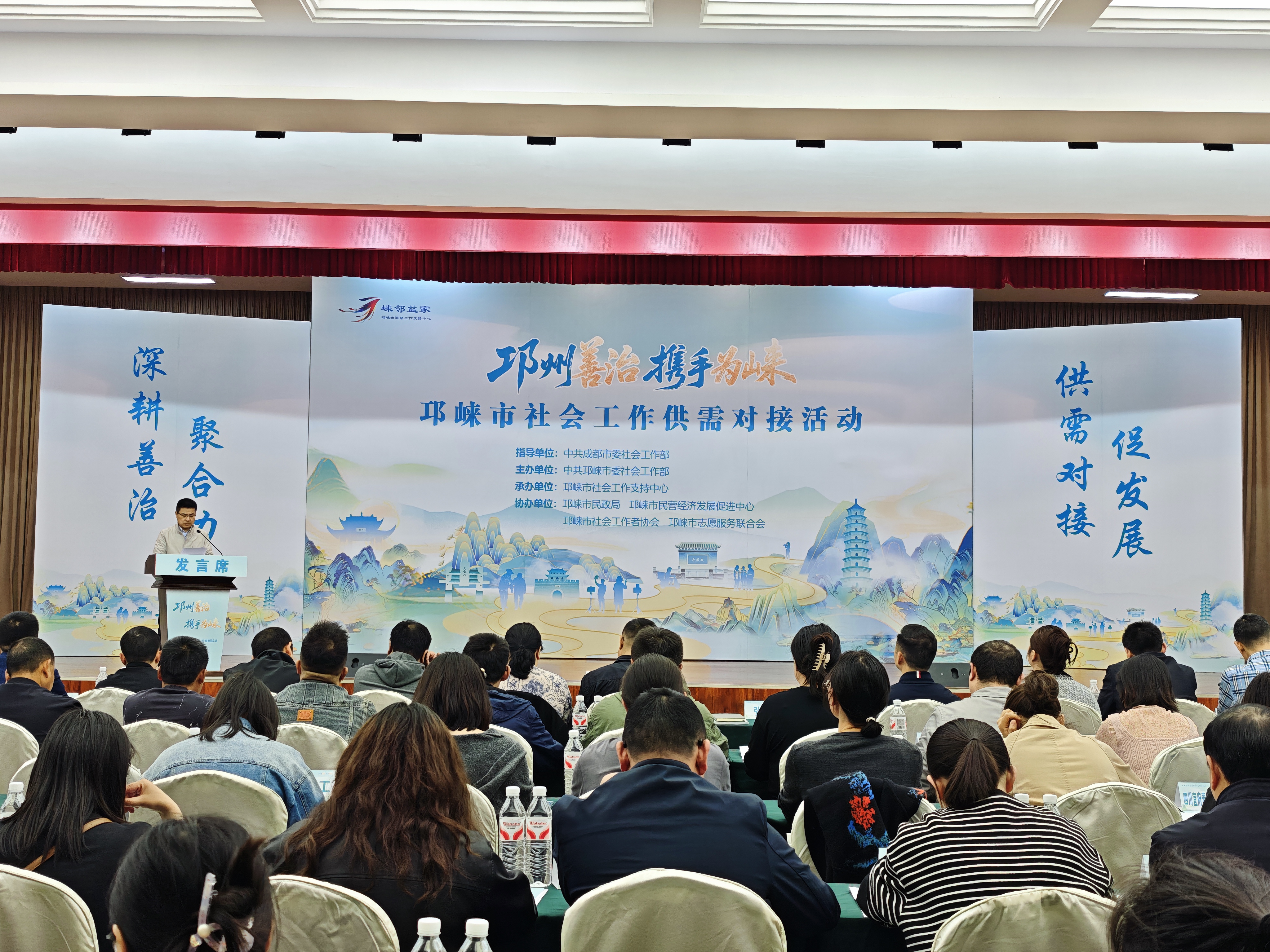 2026年4月3日,邛崃市社会工作供需对接活动成功举行。本届活动由中共成都市委社会工作部指导、中共邛崃市委社会工作部主办、邛崃市社会工作支持中心承办,活动以“邛州善治·携手为崃”为主题,立足“邛州善治”新实践,搭建“社会服务+”供需对接平台,加大优质资源供给力度,赋能社会工作和民营经济发展,推动行业协会商会联动,促进企业发展与社会责任同频共振,助力“立园满园”“进解优促”行动走深走实,打造更具活力与幸福感的现代化人民城市。