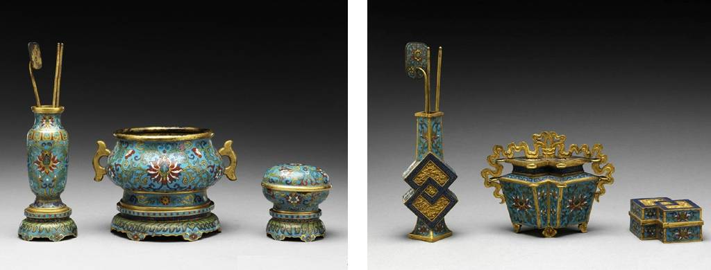 清时代流行成套的香具,炉、瓶、盒的组合称为「炉瓶三事」,是焚香必备之物。炉为焚香之用,盒用来盛放香饼、香块等香品,瓶则是方便放置香铲、香箸。