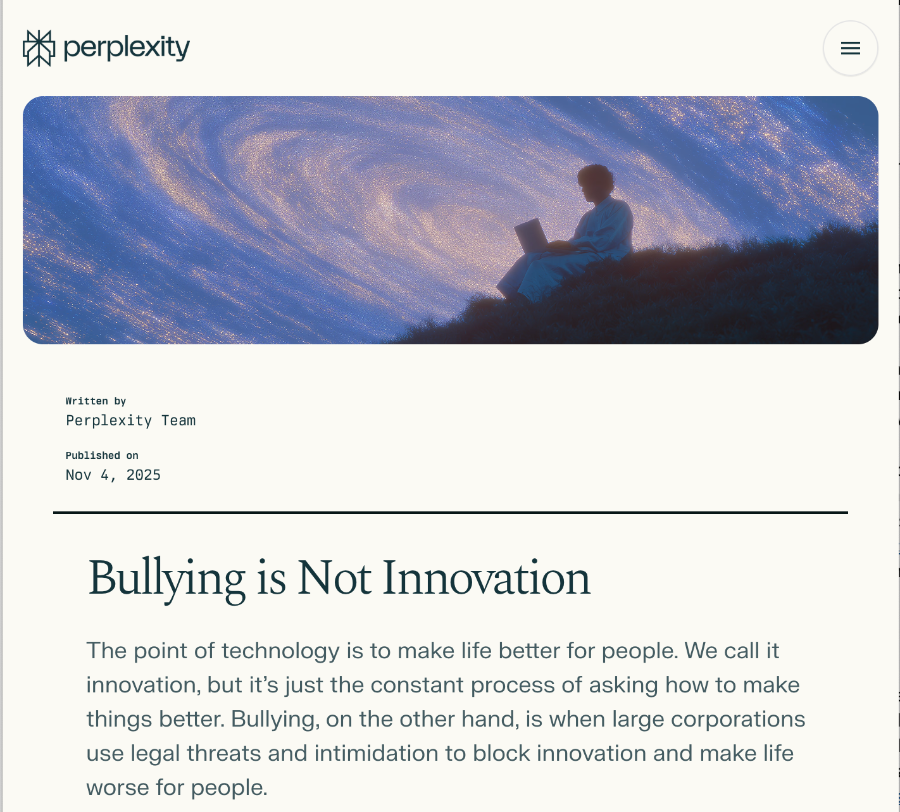 Perplexity在博客更新《霸凌不是创新》,称亚马逊为「霸凌者」