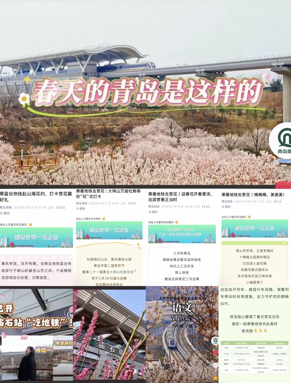 依托青岛地铁官方公众号、小红书、抖音等平台账号矩阵,持续推送赏花动线、网红打卡点位、出行温馨提示,打造“一键查阅、轻松出行”的一站式赏花攻略,让市民游客乘地铁“赏花有路、畅行无忧”。