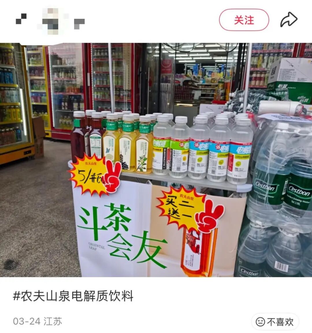此前,外星人与补水啦分别以6元和4.5元上下的定价,各自抢占了高线城市和下沉市场。但农夫山泉直接以规模优势,把价格打到了更低,在电商平台,西柚口味的电解质饮料550ml*15券后售价65元,单瓶4.3元,在线下渠道,该产品推出买二赠一、30周年开盖赢奖等促销活动,折合单瓶定价在4元以下。