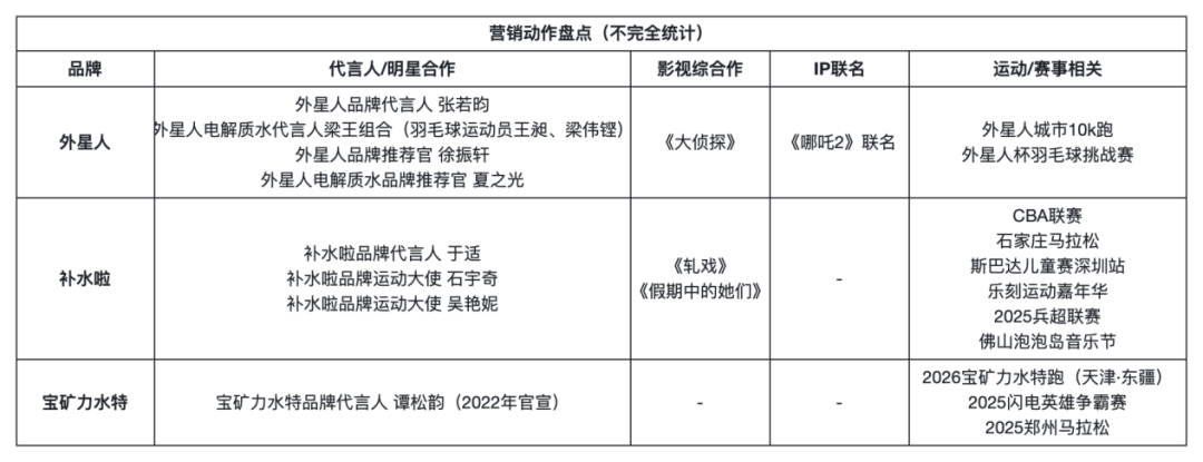 最后需要提及的是,渠道和产能是硬实力,营销也是“以小搏大”的效率杠杆,此前就有品牌方告诉剁椒Spicy,与很多艺人、IP合作是为了“搬空货架”、“吸引经销商”。前文也提到补水啦和外星人也在持续做大曝光,官宣代言人,合作综艺、音乐节、影视剧植入,与IP联名,加速转化。