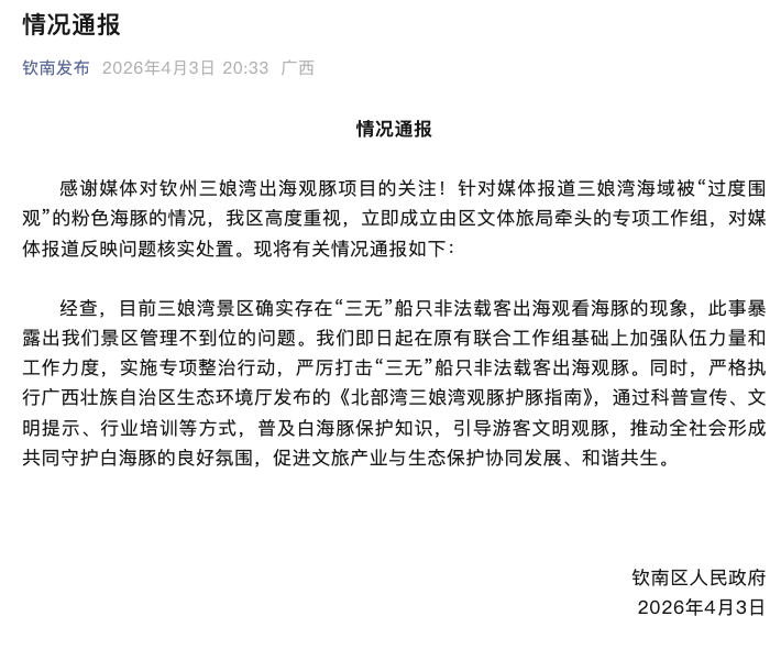 4月3日,广西钦州钦南区人民政府发布情况通报:针对媒体报道三娘湾海域被“过度围观”的粉色海豚的情况,我区高度重视,立即成立由区文体旅局牵头的专项工作组,对媒体报道反映问题核实处置。