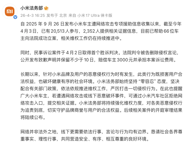 4月3日,小米集团法务部发文表示,自2025年9月26日发布小米车主遭网络攻击专项援助信息收集以来,截至今年4月3日,已有20513人参与,2352人提供相关证据信息,目前已帮助66位车主向法院成功立案,相关维权工作仍在持续推进中。同时,民事诉讼案件于4月2日取得首个胜诉判决。法院判令被告删除侵权言论,公开发布致歉声明并保留不少于10日,赔偿车主3000元并承担本案诉讼费用。