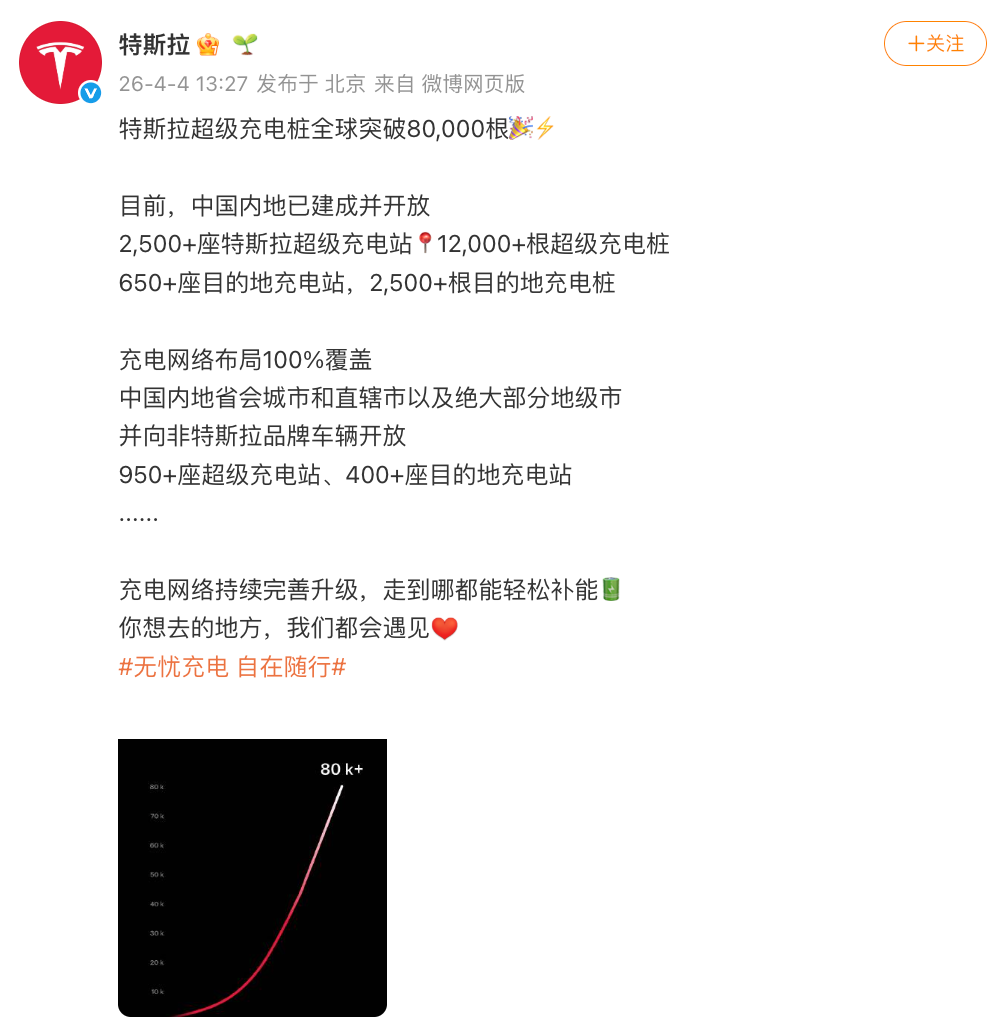 据特斯拉消息,特斯拉超级充电桩全球突破80,000根。