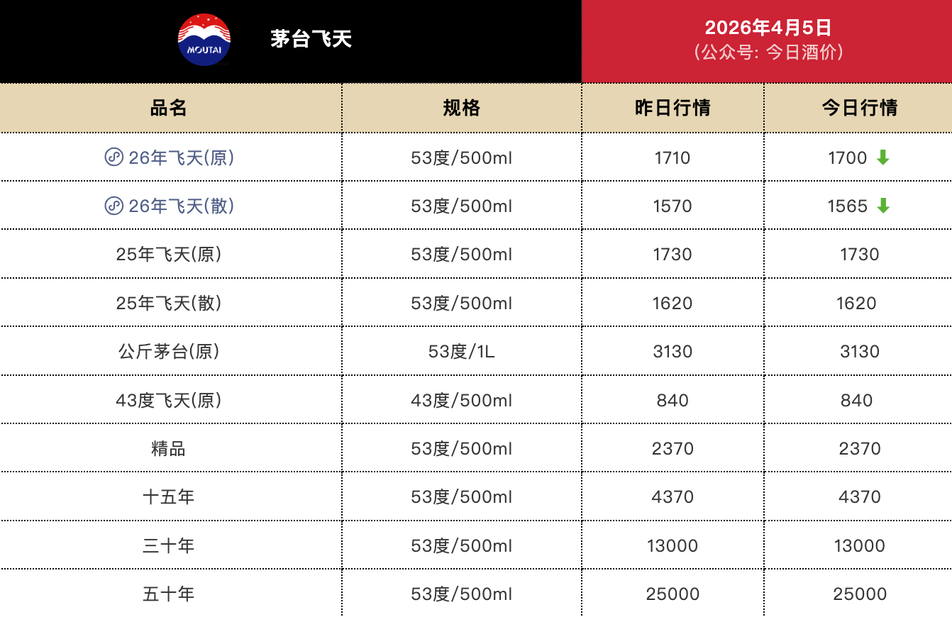 “今日酒价”披露的最新批发参考价显示,4月5日,2026年飞天茅台原箱报1700元/瓶,较上一日下跌10元;2026年飞天茅台散瓶报1565元/瓶,较上一日下跌5元。