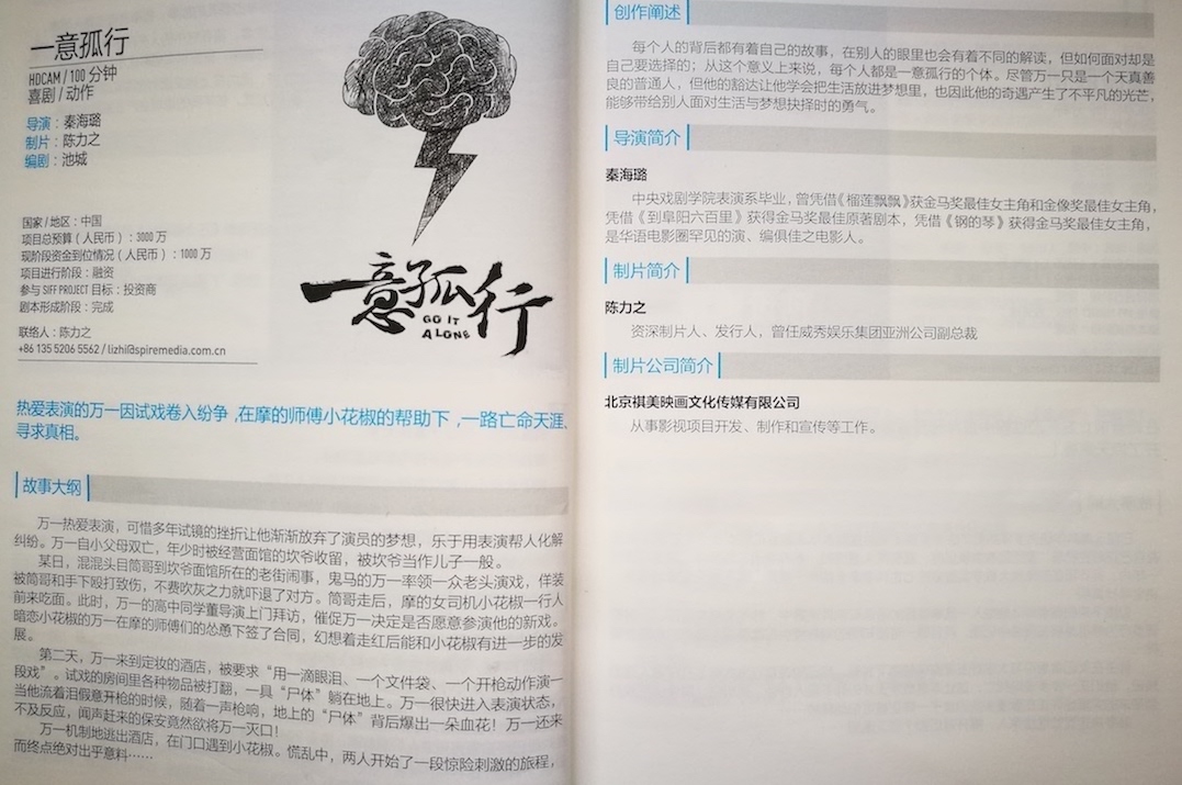 组委会印发的《电影项目创投》手册中有入围项目简介,内容包括导演、编剧、制片人简介,故事大纲,制作公司简介,项目进行阶段,参与创投目标,项目总预算以及现阶段资金到位情况等等。第55页上是秦海璐的《一意孤行》。作为新人导演,她的项目预算不是最高的,3000万,现阶段资金到位为1000万。